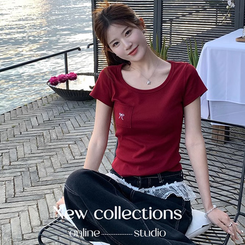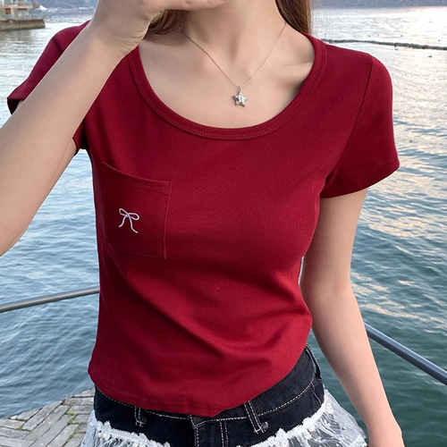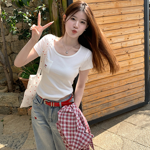 92棉8氨纶 慵懒百搭刺绣口袋圆领短袖T恤女修身显瘦内搭小上衣潮